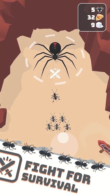 1、蚂蚁之间也会产生各种战争,在不同的蚂蚁地盘争夺领土和食物,合理的布置阵容赢得胜利。