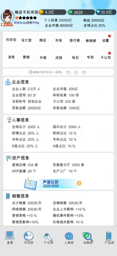 国产手机帝国游戏最新官方版等你来线上欢乐经营自己的手机公司吧,非常自由有趣的公司经营体验来袭,去开启属于你的更多带感畅快操作,打造一部和华为可以相媲美的国产手机吧,更多的功能等你来随意探索升级,慢慢变得更加高大上,最终能产生更多的销量,喜欢的话就赶紧一起来模拟尝试吧。