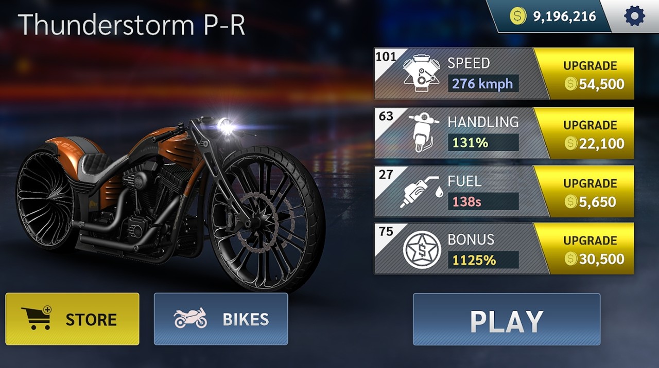 用户可以整体改装摩托车,以提高性能,挑战危险道路,以速度征服不同的对手。