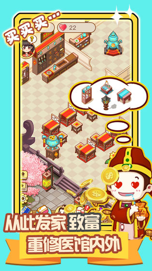 2、玩家购买桌子椅子和扩大自己的店铺容纳更多的患者。