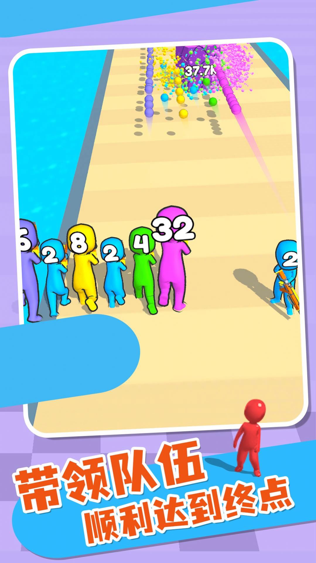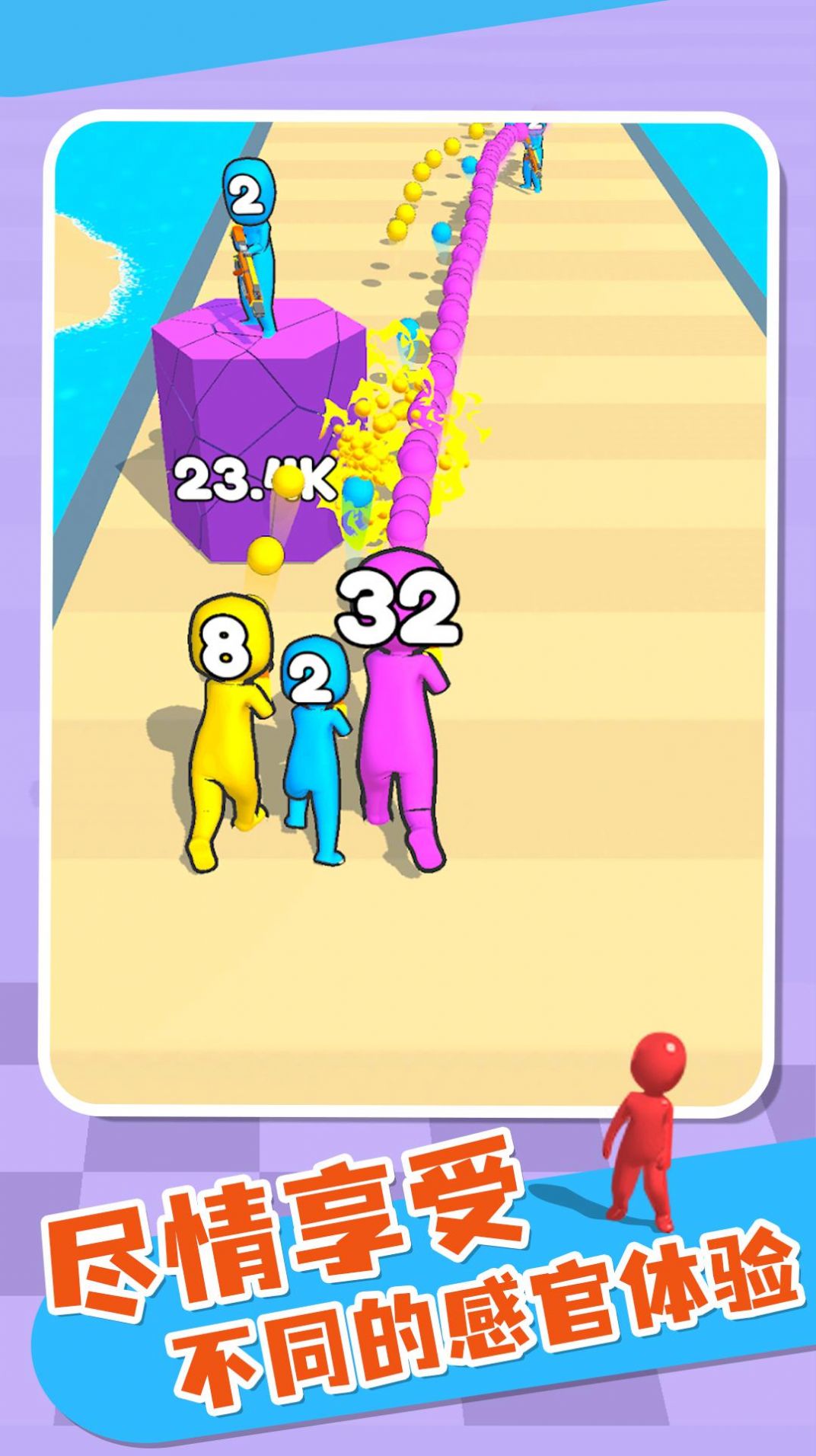 在游戏中体验最有趣的跑酷模式,在奔跑的同时吸引更多人加入到队伍中,快速射击消灭敌人和障碍物,用最短的时间抵达终点,丰富多样的场景设计,你可以看到很多有趣的事物,灵活使用道具来提升速度,强化队伍的战斗力,轻松完成所有的关卡挑战。
