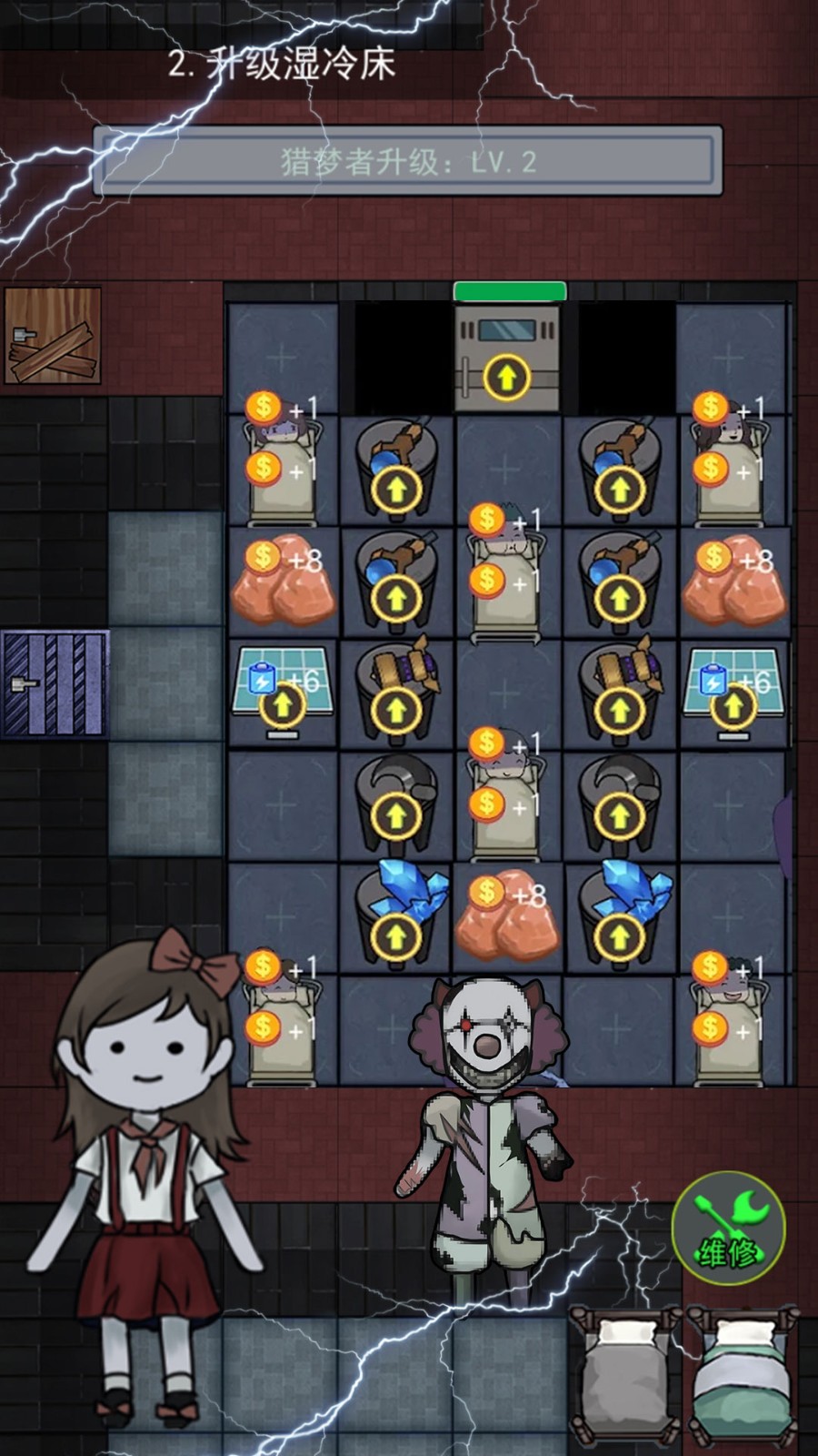 1.游戏中玩家需躲避猛鬼的追捕,寻找适合自己的宿舍躲避,并发展经济建造炮台,抵御猛鬼。
