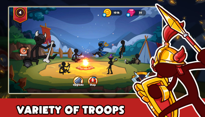 1.亲临激烈热血的对抗战场,指挥火柴人勇士展开作战,火柴人士兵进行训练提升实力。