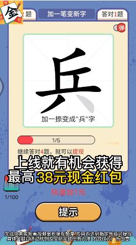 一笔点金红包版是一款汉字类型的益智闯关游戏。添一笔变成另外一个汉字,将我们汉字的特点进行充分的发挥,让各位玩家在这里可以充分感受到益智闯关的精彩,在闯关的过程中感受到汉字字形构造的魅力,完成关卡的任务就能够领取奖励,超多关卡挑战超多红包奖励,可不要错过哦!