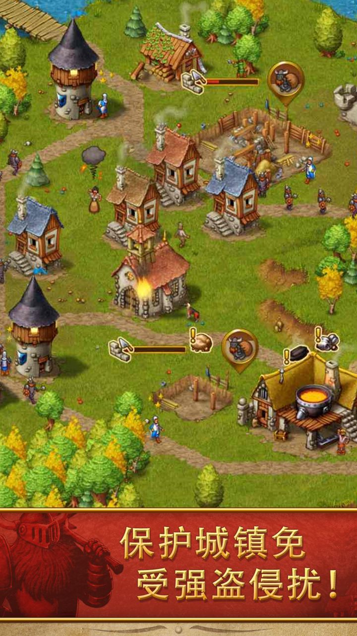 3、土匪在附近出没,寻机掠夺和打劫您的和平城镇。建造兵营,招募勇敢的士兵,建造守卫塔。