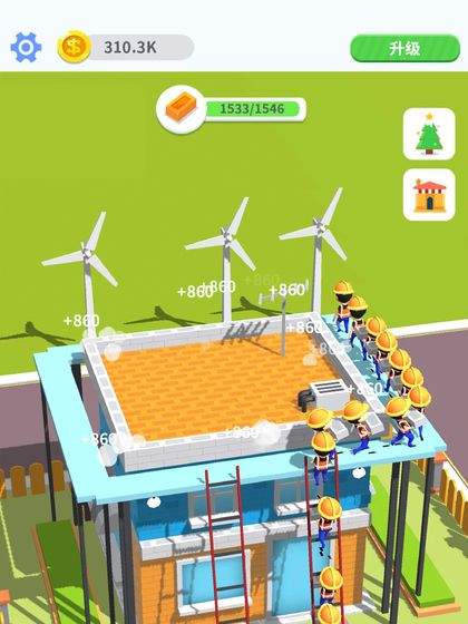 在疯狂搬砖游戏中升级扩大收益,增加工人数量及速度,来扩大你的建筑区域。