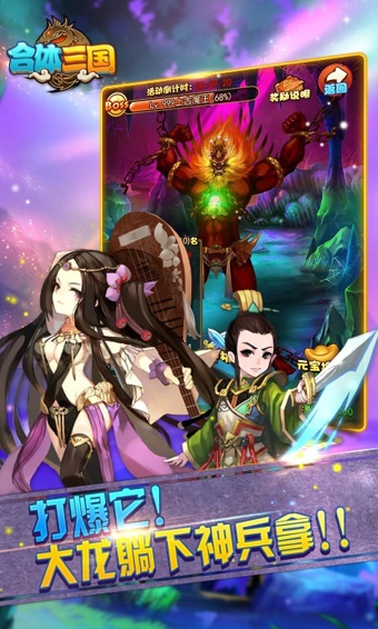乱世三国硝烟云起,群豪揭竿智斗合体!惊艳视觉的三国萌将,灭世霸气的英雄合体,别样三国之战尽在《合体三国》。真实还原三国雄伟战场,亲临指挥踏破千军万马;这里有三国英雄义薄云天,也有巾帼须眉风姿妖冶;这里有无双谋士谋定天下,更有智勇将军中帐临战!