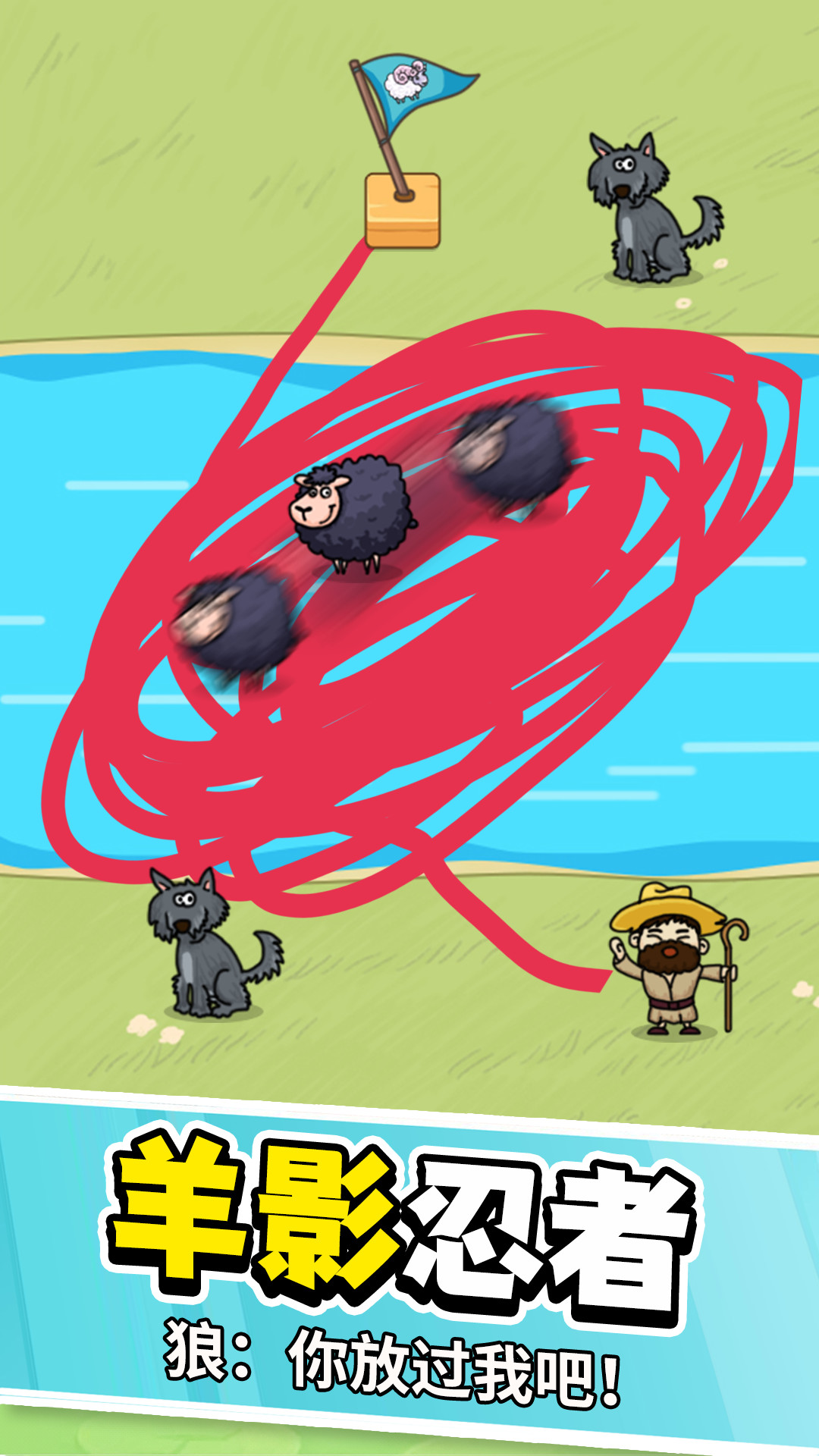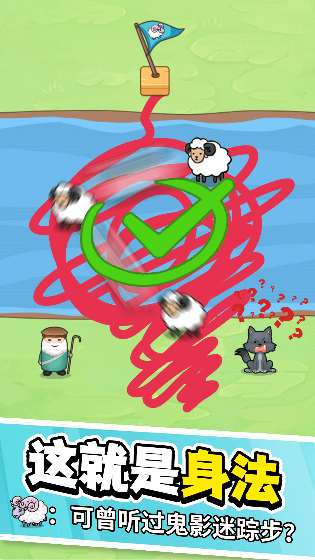 2、用手指画一条线,让它们顺利过河,小心不要撞到一块了。当心一些,撞到一块的话只能从头再来了!注意小羊不要被大灰狼吃掉哦~