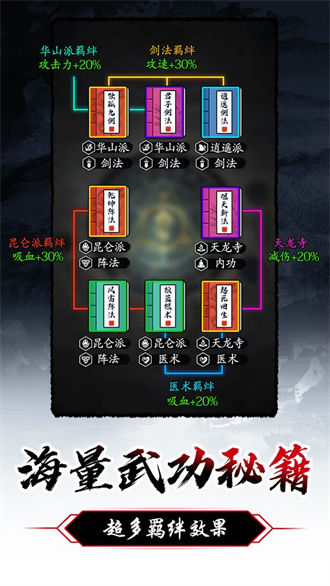 武侠元素perfect融入游戏,玩家需要做出各种武侠的组合,包括不同种类的门派,都有自己ユニーク的特点,都想更好更快的赢得游戏。