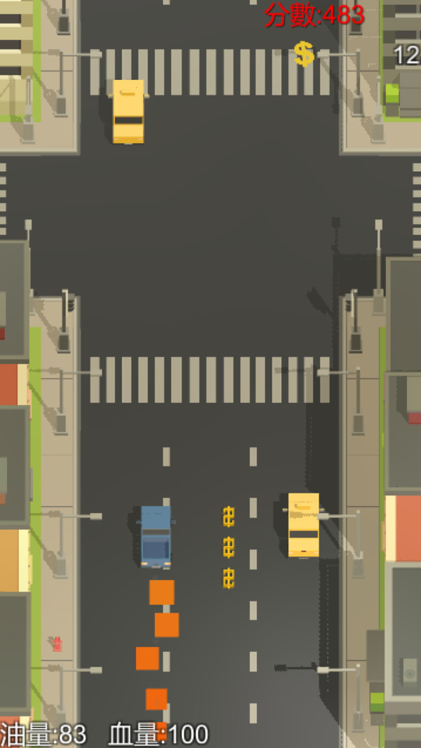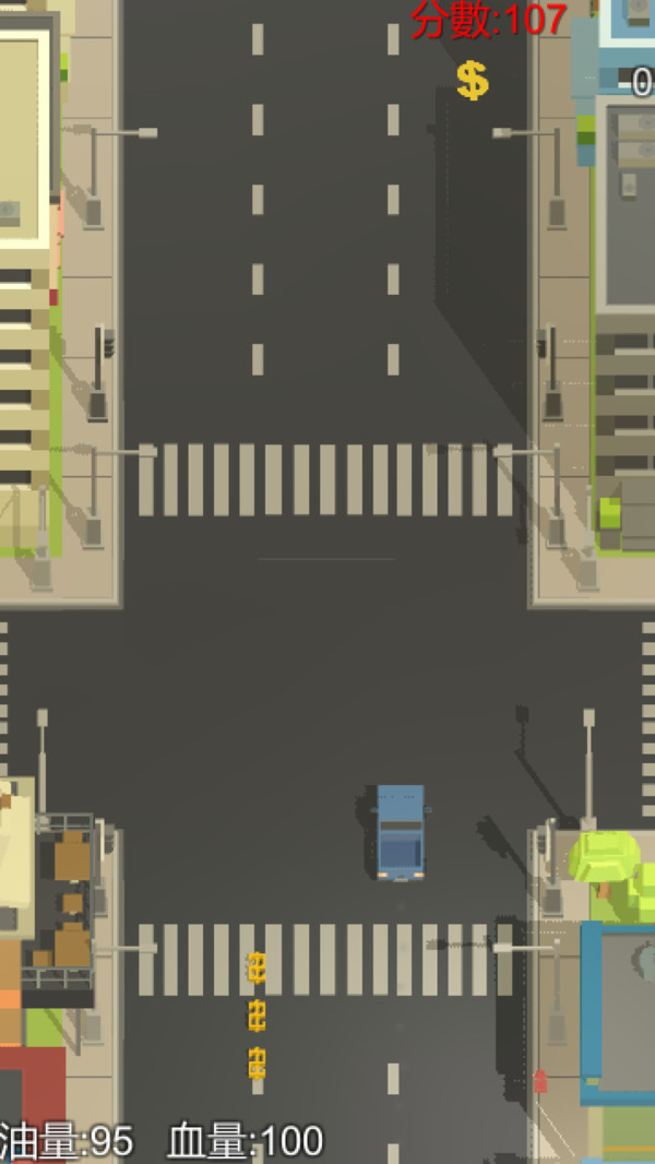2、控制汽车拾取路上的血包以及油箱、金钱