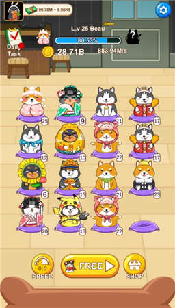 1、经典的合成玩法,只需要合并就能够解锁高级品种小狗崽;