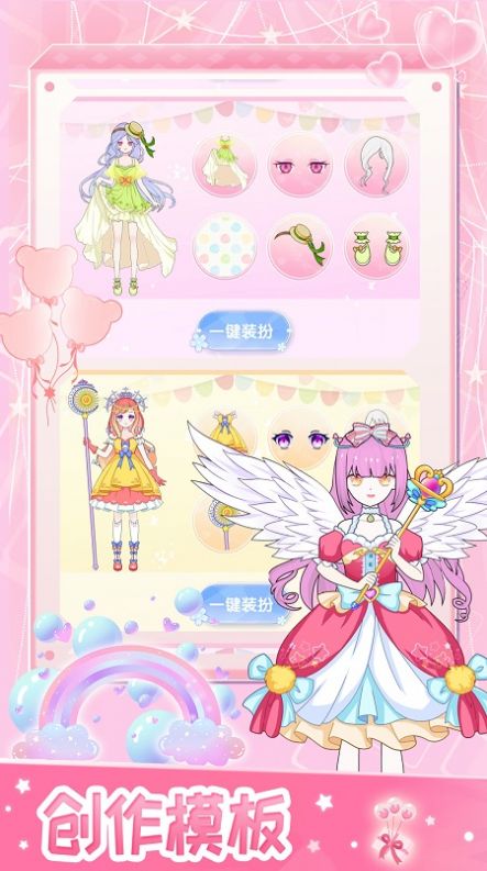 1、二次元风格的画面,每位角色都有独特的形象,你要选择合适的服装快速进行搭配。