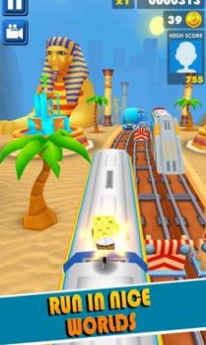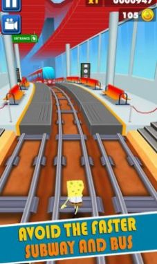 1、卡通场景中控制海绵宝宝完成自由闯关的跑酷游戏,在这里的环境也是以地铁的形象设置为主。