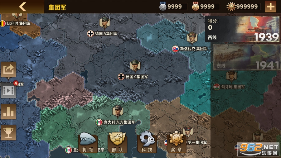 部署集团军部队,每个国家有其专属科技卡牌,通过科技卡牌加速征服世界的进程。