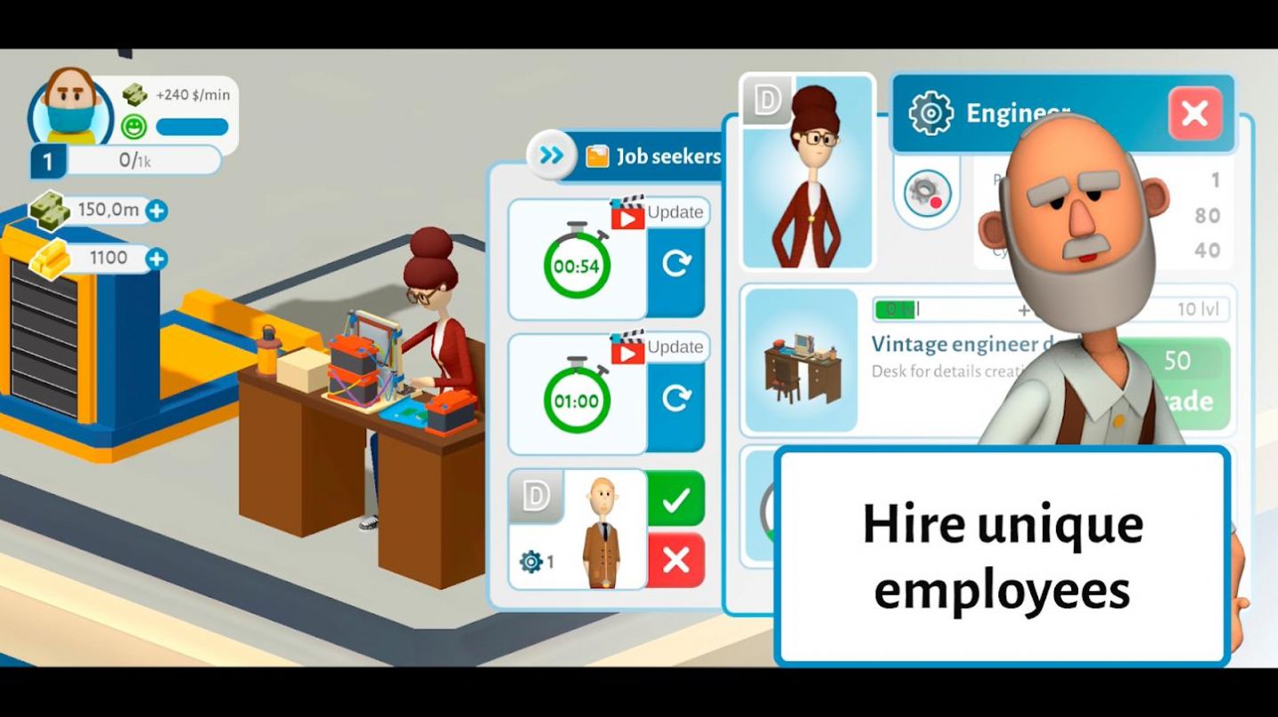 大老板创业是一款非常有创意的模拟经营游戏,让我们经历白手起家到亿万家产的刺激爽快,从一家普普通通的小作坊开始,满满发展我们的商业版图,不断扩大我们的工作室,不断招募更多的员工,让我们的工作室一点点繁荣起来,不过在这个过程中我们每一步的选择都是至关重要的!