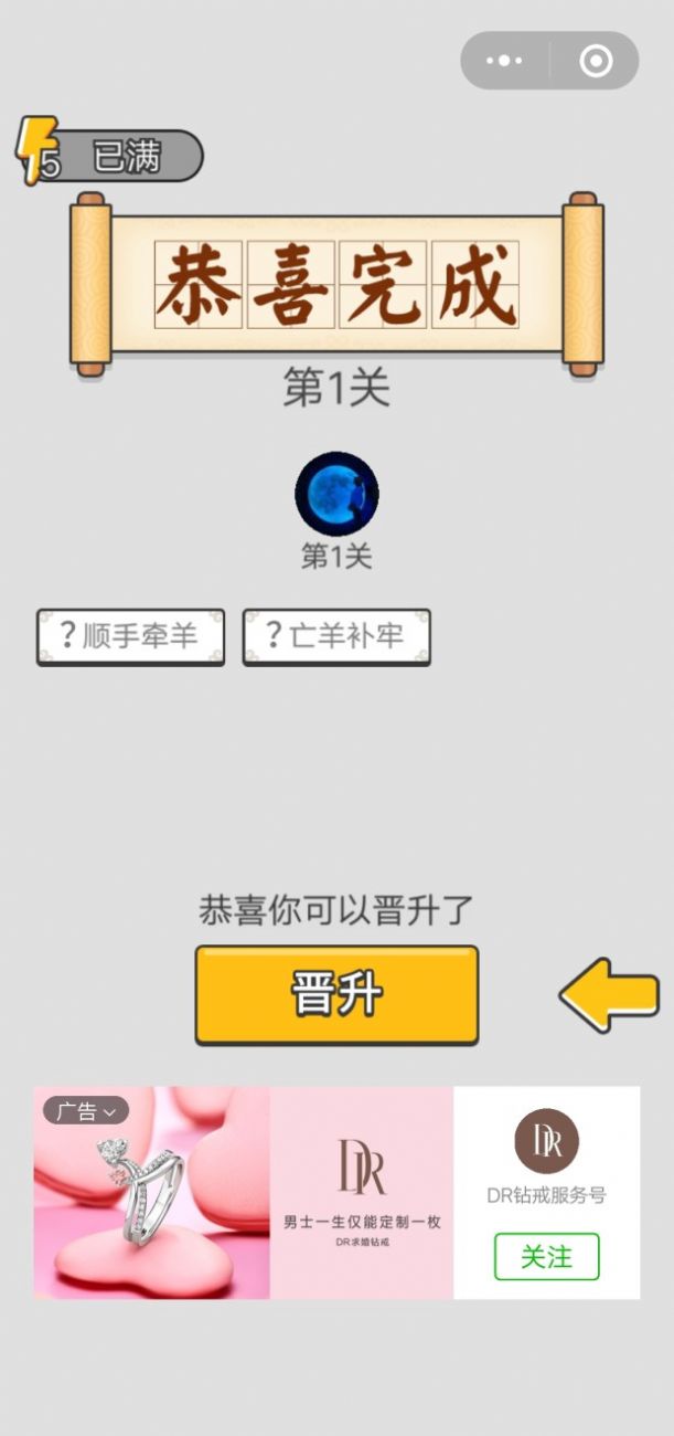 2、每个问题里随机组合多个成语,完成填空题的挑战,体验闯关玩法,根据游戏规则连续完成多少关卡。