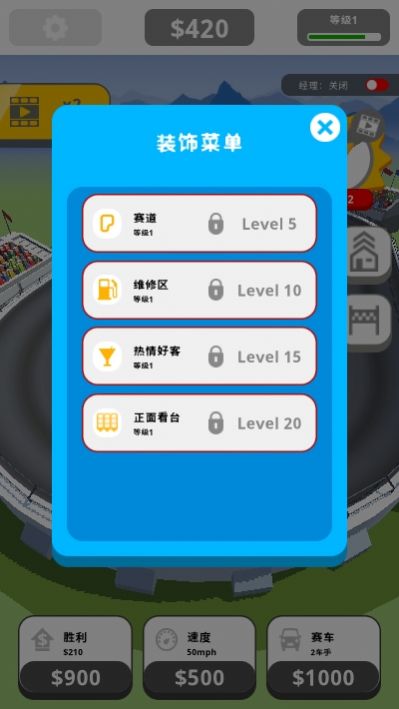 3、游戏中的赛道你自己也可以不断的升级,可以吸引更多的赛车手。