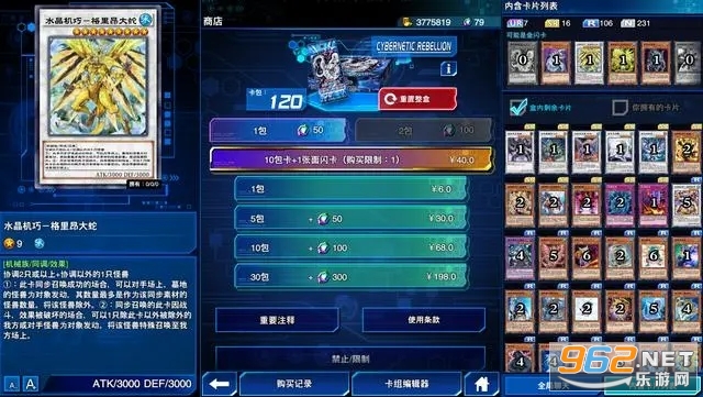 游戏中玩家可以使用金币和宝石,以及在达成成就时给的兑换券去购买卡包,每包卡包可以给与玩家3张卡片,玩家可以收集大量的卡牌来组成卡组。不过这里的规则与游戏王的通用规则相同,主卡组40张,副卡组15张,重复的卡牌不可以超过3张,手牌不能超过6张。而游戏中本身不限制卡组的组合,魔法陷阱怪兽自由搭配,组合还是非常多的,组建自己的卡组也是此类游戏的趣味所在啊。