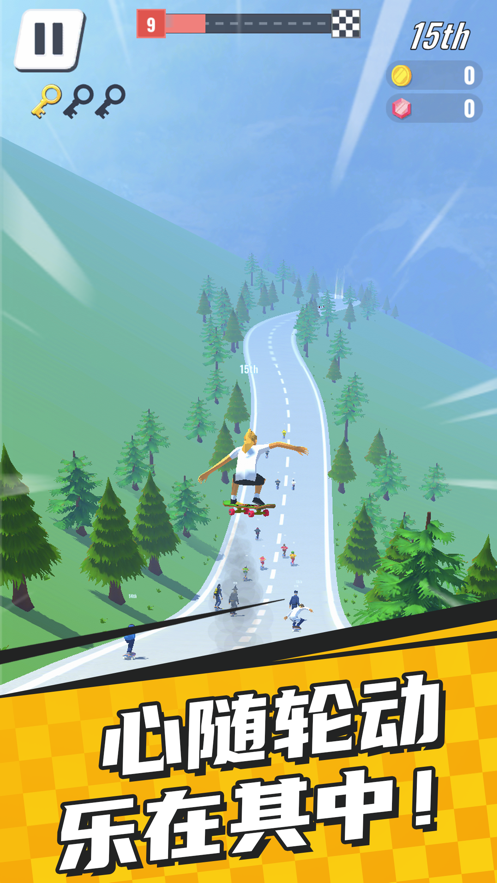 1、是一款体育滑板休闲项目的冲关游戏挑战,滑板大冲关游戏需要避免所有的障碍物,快速的冲刺来躲避对手;