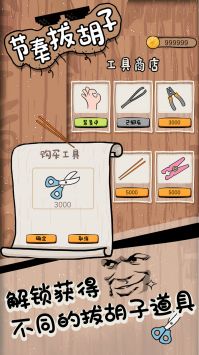 节奏拔胡子是一款有趣的手机游戏。游戏中有许多工具,从赤手空拳到用钳子拉。玩家可以在完成游戏关卡后解锁新的拔胡子工具。