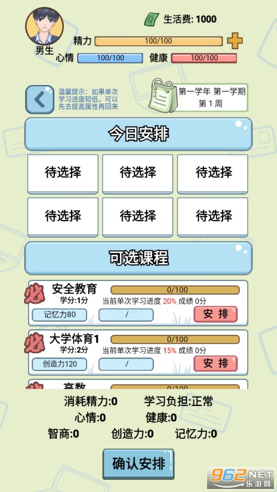 一款不错的休闲模拟游戏,游戏中根据你的属性不同的课程有着不同的学习进度,同时你还需要照顾自己的心情和健康,游戏的操作简单容易上手,还有着有趣的挑战等待着你,游戏的操作简单容易上手,推荐给喜欢休闲游戏的玩家。