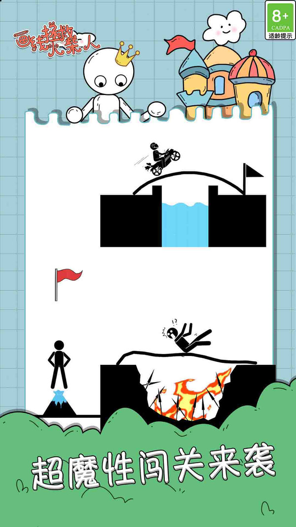 1、根据关卡给出的场景,思考该如何画线才能救救火柴人。