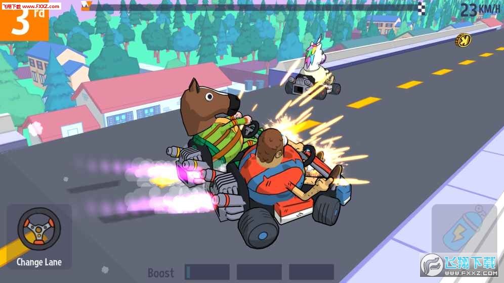 收集各种造型怪异的卡丁车!使用各种手段将对手撞翻在赛道上