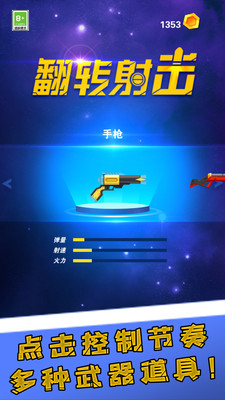 翻转射击是一款非常有趣的休闲射击游戏,在游戏中,玩家需要不断点击屏幕进行射击,利用射击强大的后坐力将手枪翻转起来,玩家还可以解锁更多的武器。让游戏玩起来更刺激。对翻转射击这类游戏感兴趣的玩家不妨下载试试吧。