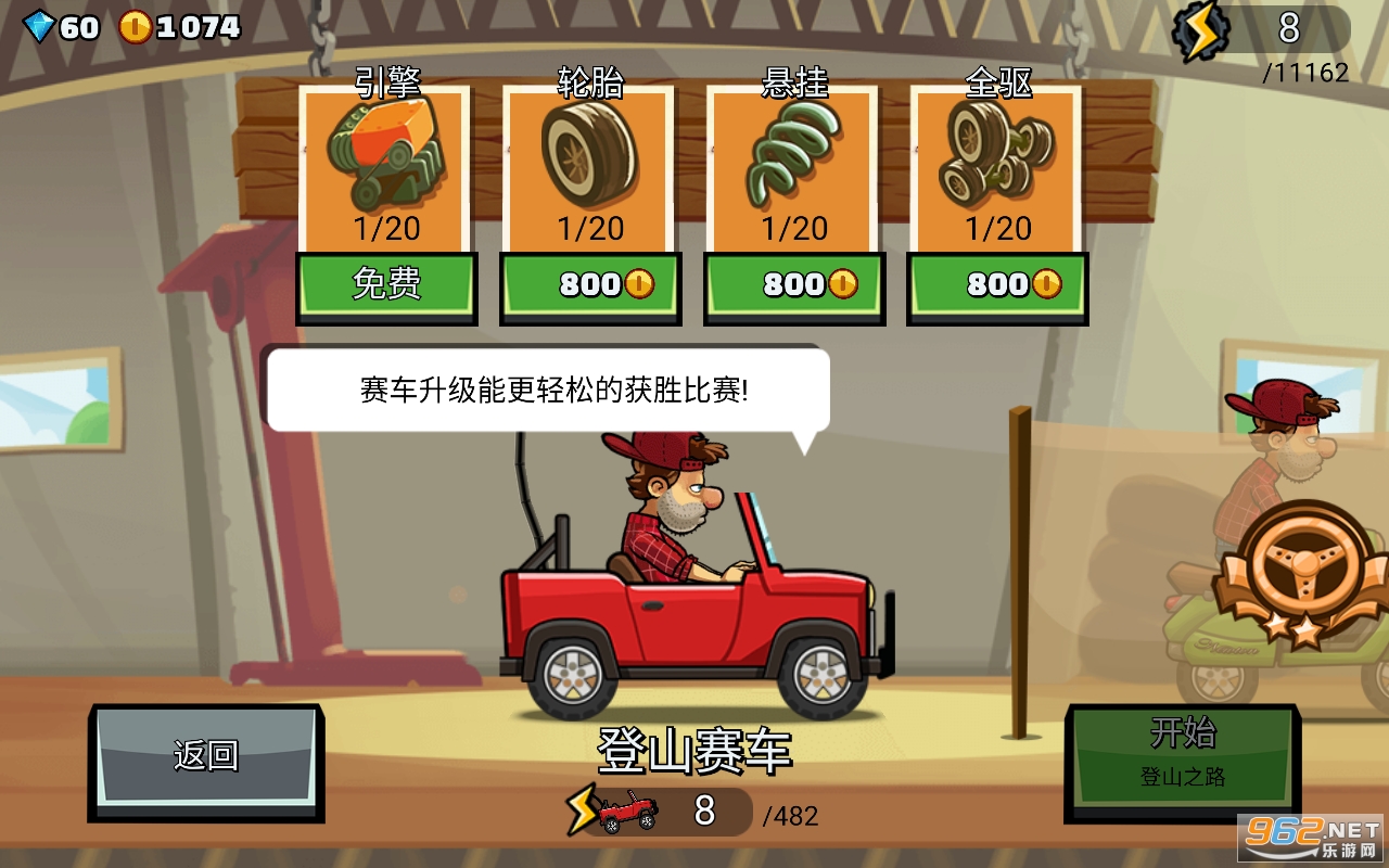 游戏会记录玩家每个关卡到达的等级和最大距离,用获得的奖金可以在在车辆选项里面换新车,不过对一个小游戏也不用指望有什么种类丰富的车可选,总共就三两,一辆普通吉普车,一辆大轮越野车,一辆看起来略牛逼的跑车。此外玩家还可以升级车辆的四大部件,让车子获得更好的驱动力、弹跳和平衡性,争取到达更远的距离。