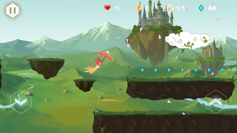 2、飞行跑酷:带着你的小红伞飞起来吧!你可以在飞行过程中收集各种水晶,它们是你能够开通下一篇章的重要道具;