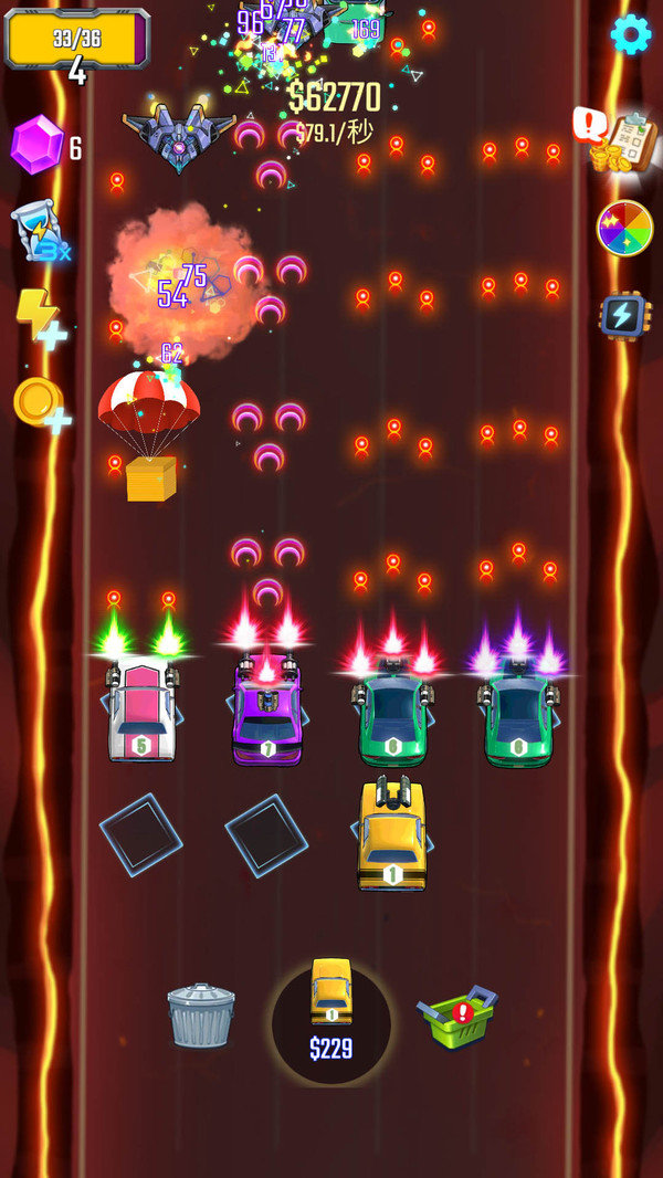 模拟合成战车是一款非常有趣的放置类飞行射击游戏,这款游戏也结合了放置的游戏玩法,玩家需要在游戏里不断的收集更多的战车来抵抗敌人的攻击,也能通过合同相同等级的战车来获得更加强大的战车,会有更强大的威力。