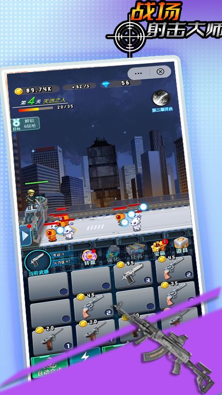 3.很多不同型号的枪械实时展示,可以通过闯关或者金币购买的方式来获得,轻松体验。