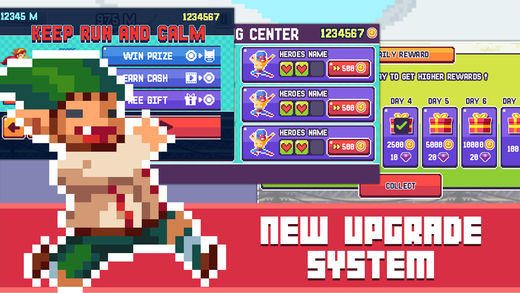 游戏收集到一定的金币可以解锁新的英雄,英雄越多你就有机会跑的越远,因为撞的怪多了就可以增加一个英雄在你的队伍里和你一起跑,相当于一条命。所以如果解锁的少就没有那么多英雄了,游戏中会有很多有意思的道具,道具千奇百怪,游戏结束还有抽奖,抽奖500块,可以在下一轮多一个属性加成,还有任务,任务完成一个给500块。游戏中还可以收集字母拼成单词,拼成单词后会冲刺几百米,游戏内容很丰富。