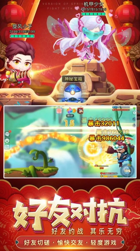 这是一款Q版弹跳对决游戏,挑战性非常高的弹道抛射方式让您感受不一样的作战快乐,游戏内有丰富有意思的探险团本,令人兴奋的试炼场对决,轻松自在的社交媒体感受,更有各种各样设计风格主题风格的服饰可随意配搭改装,快邀约你的小伙伴们,一起来玩乐吧!