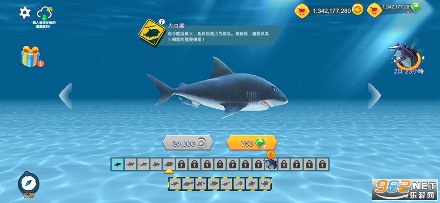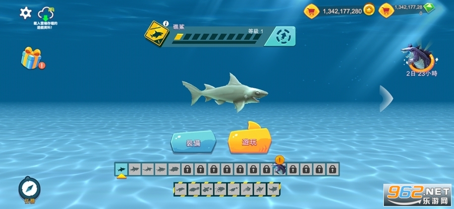 完成50个任务,寻找宝物取得金币与宝石,用来升级你的鲨鱼或者购买特殊救生道具。