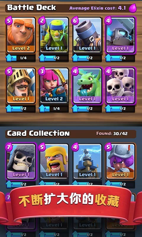 赢取宝箱来解锁奖励、收集强大的新卡片,以及升级现有的卡片。