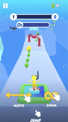 2、通过收集宝石来获得金币,增加生命值,并获得更高的分数。同时,还可以使用各种技能和道具,打败随处潜伏的红鲨和鲨鱼,闯过每一关卡,挑战更高的分数。