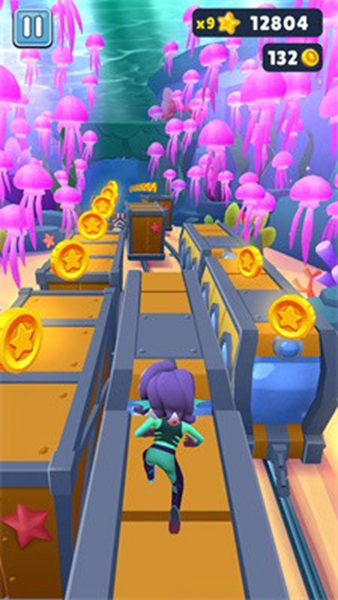 1、开始在水下城市奔跑,使用新的滑板和角色服装,体验不同的水下之旅,享受快乐的游戏时光。