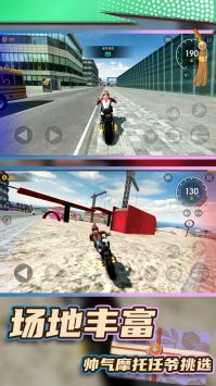 刺激飙车模拟是一款摩托车竞速的闯关类游戏,这留着非常多的炫酷摩托,你可以选择自己喜欢的模特来进行挑战,不断提升自己的驾驶技巧和驾驶技术,才能更好的进行前进,完成更多的驾驶任务,还能够在这里获得更多的游戏皮肤,感受不同的游戏玩法。