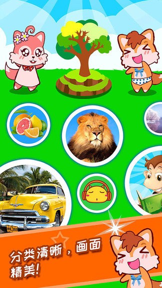 2、认识常见的动物、食物、交通、风景等。其中动物和部分景区车辆有声音,