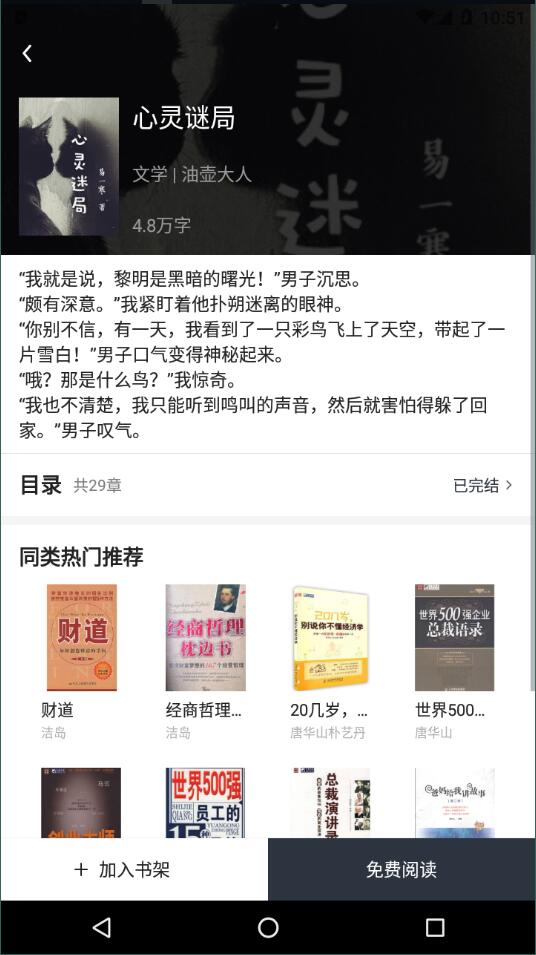 1、软件除了对应小说的介绍外,还会给出下面类似小说的推荐;