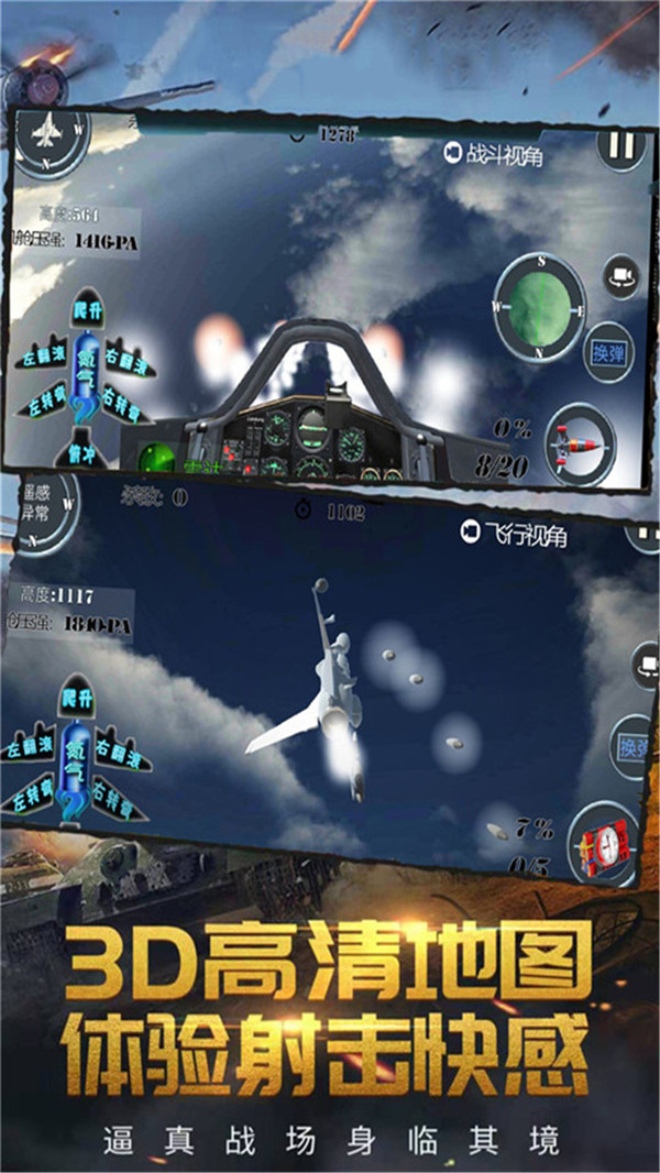 精英战场高度模拟飞机驾驶,你能自由的选择左右旋转,俯冲或者是飙升等等