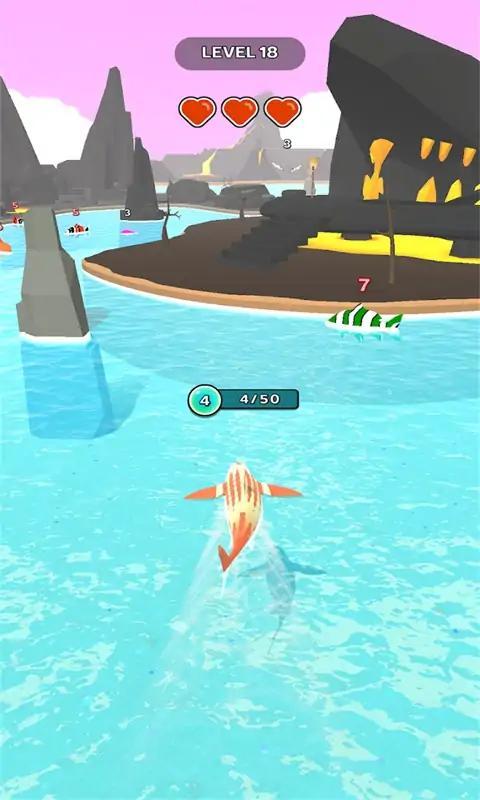 1、该游戏使玩家扮演鲨鱼在海洋中自由游动,不断寻找猎物,吞噬成长。