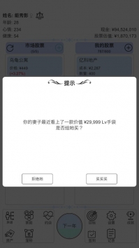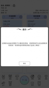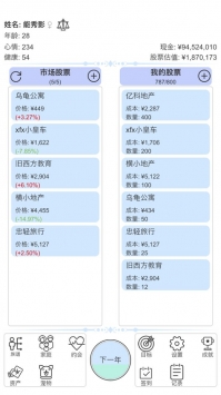 模拟炒股人生作为一款以文字剧情为主的人生模拟游戏,在游戏里玩家在游戏里面将扮演一名资深的股民,通过不断的买卖股来为自己赚取更多的收益,股票的买卖需要看好时机,在游戏里玩家可以在不断的挑战中学习更多的经验,切不可贪婪。文字式的剧情发展使玩家更好的代入进去,感受变幻莫测的人生。