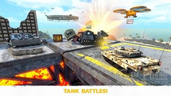 2.在天空竞技场轰爆或撞飞对手,获得分数,主宰战斗竞技场。获得胜利,从而购买新的坦克 每都有独特的玩法。来精彩的坦克战模式里大轰特轰吧
