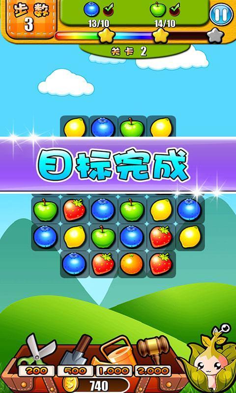 水果消除游戏的面很有年代感,制作的背景很简单,在游戏里面的玩法设计也是最经典的三消风格模式;只要用户在规定的步数或时间内将消除的分数达到满星就可以无障碍通关了;喜欢的用户快来haolingcc下载吧。