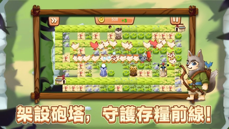 3、驾设炮台,守护粮食存量,面对众多来袭的怪物,玩家可以使用各种炮台进行攻击,将一个个的怪物击败在粮仓之前。