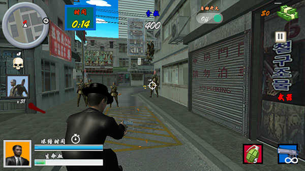 3、有了武器之后,就可以开始战斗了,操作方式非常的简单易上手,左边控制瞄准方向,右边使用武器射击等等;