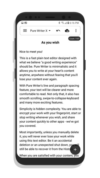 纯纯写作作为一款一个非常简单的纯文本编辑器。用户可以通过纯纯写作付费编辑文字。完美的行距和段距,无需用户自行调整。文字也会很舒服,有历史记录、段落间距、多种文章防丢失功能,还有很多写作辅助功能。快来haolingcc下载体验吧!
