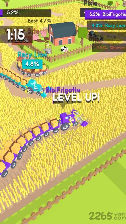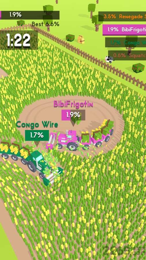 2.模拟广阔农场的卡通风格画面,控制收割机开启多人混战。
